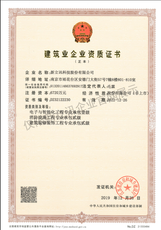 近日,經(jīng)江蘇省住房和城鄉(xiāng)建設(shè)廳審核批準(zhǔn),新立訊科技股份有限公司成功取得“電子與智能化工程專業(yè)承包壹級(jí)資質(zhì)”。該項(xiàng)資質(zhì)為電子工程、建筑智能化行業(yè)最高等級(jí)資質(zhì),對(duì)企業(yè)綜合實(shí)力有嚴(yán)格的要求,獲得此資質(zhì)可承擔(dān)不受限額的各類電子工程、建筑智能化項(xiàng)目。