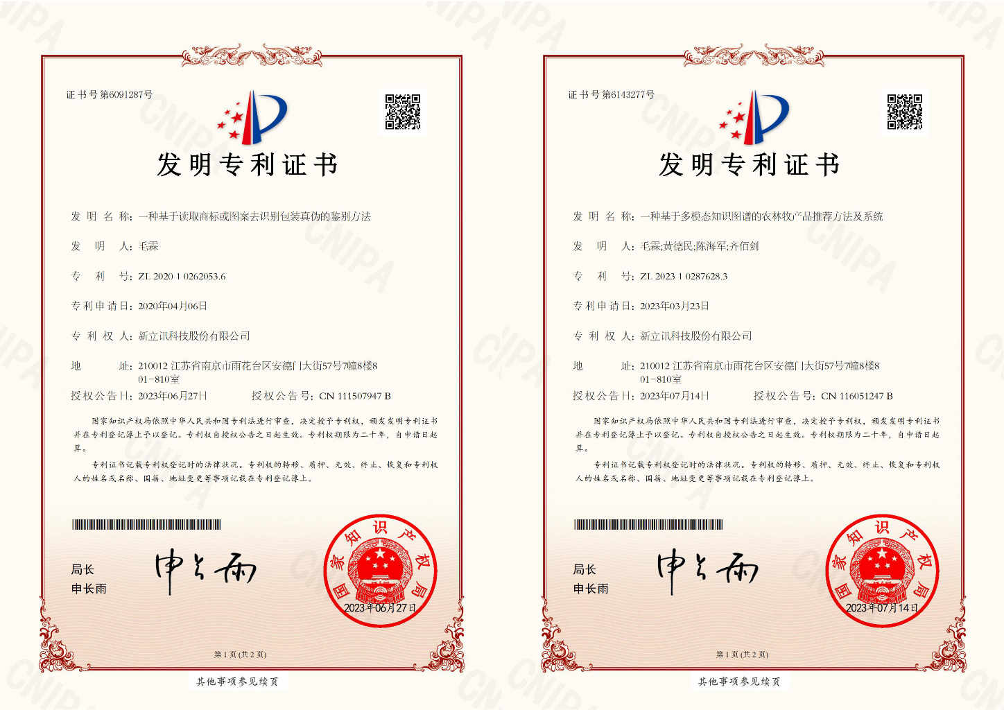7月,新立訊知識產(chǎn)權(quán)領(lǐng)域再獲兩項(xiàng)發(fā)明專利,分別是“一種基于讀取商標(biāo)或圖案去識別包裝真?zhèn)蔚蔫b別方法”(專利號:ZL202010262053.6),“一種基于多模態(tài)知識圖譜的農(nóng)林牧產(chǎn)品推薦方法及系統(tǒng)”(專利號:ZL202310287628.3)均為我司原始取得,是技術(shù)創(chuàng)新和研發(fā)方面取得的重要成果。